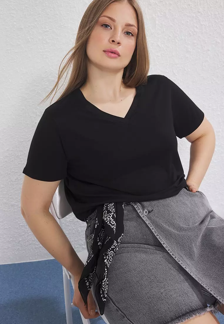 Black Regular Fit V Neck Plus Size T-Shirt Tbbss25Bf00062