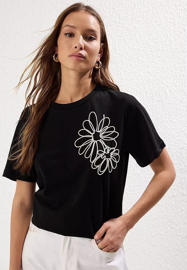 TrendyolBlack Regular/Normal Pattern Flower Embroidered Knitted T-Shirt859.00771.00
