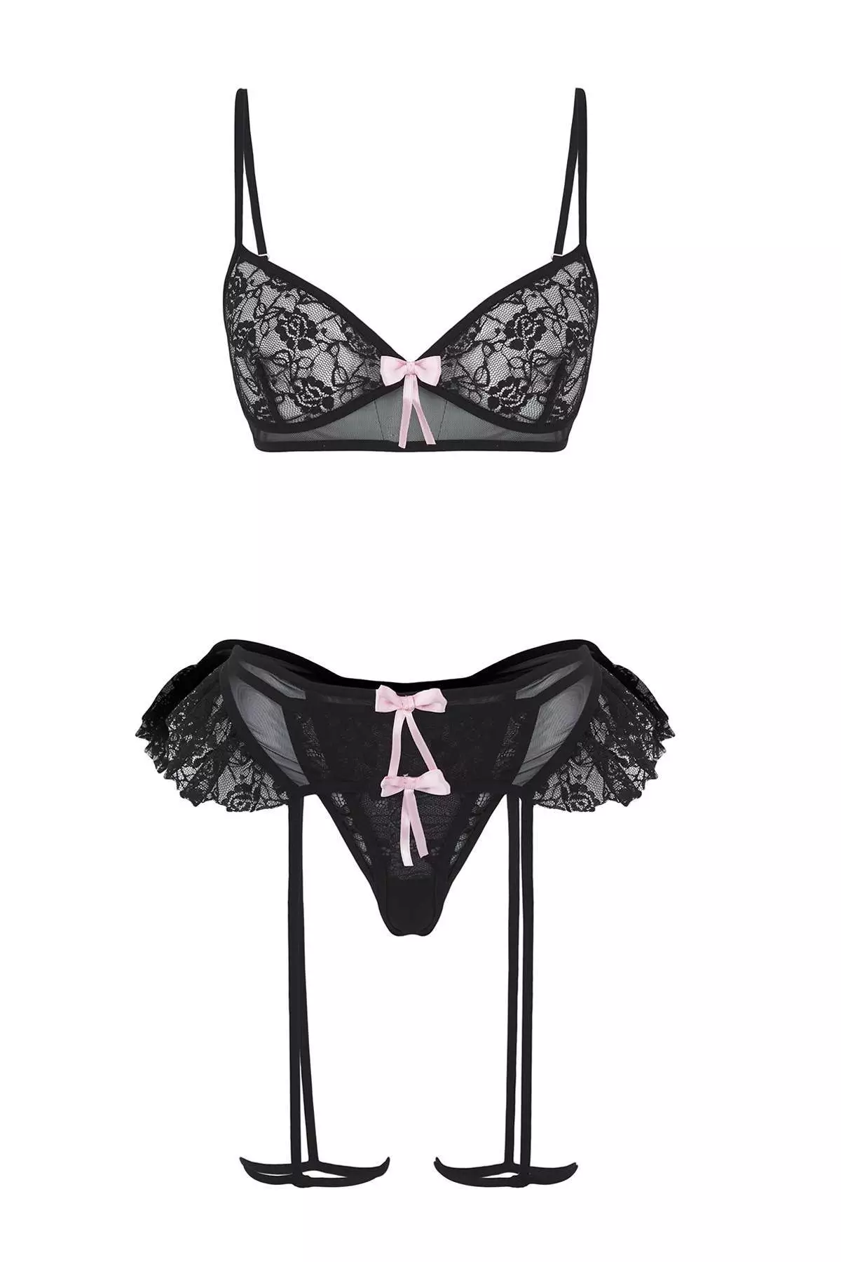 Black Ribbon Detailed Leg Band Ruffle Coverless Lace Fantasy Lingerie Set