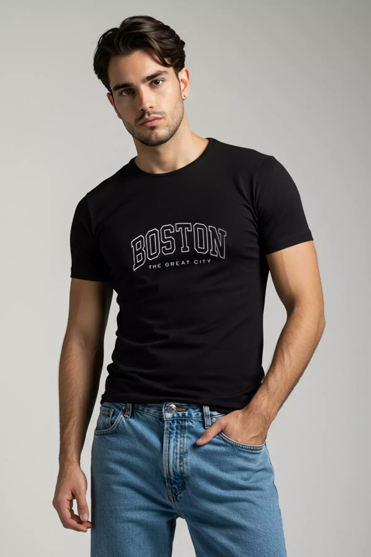 Black Slim/Fitted Boston Printed Cotton T-Shirt Tmnss25Ts00183