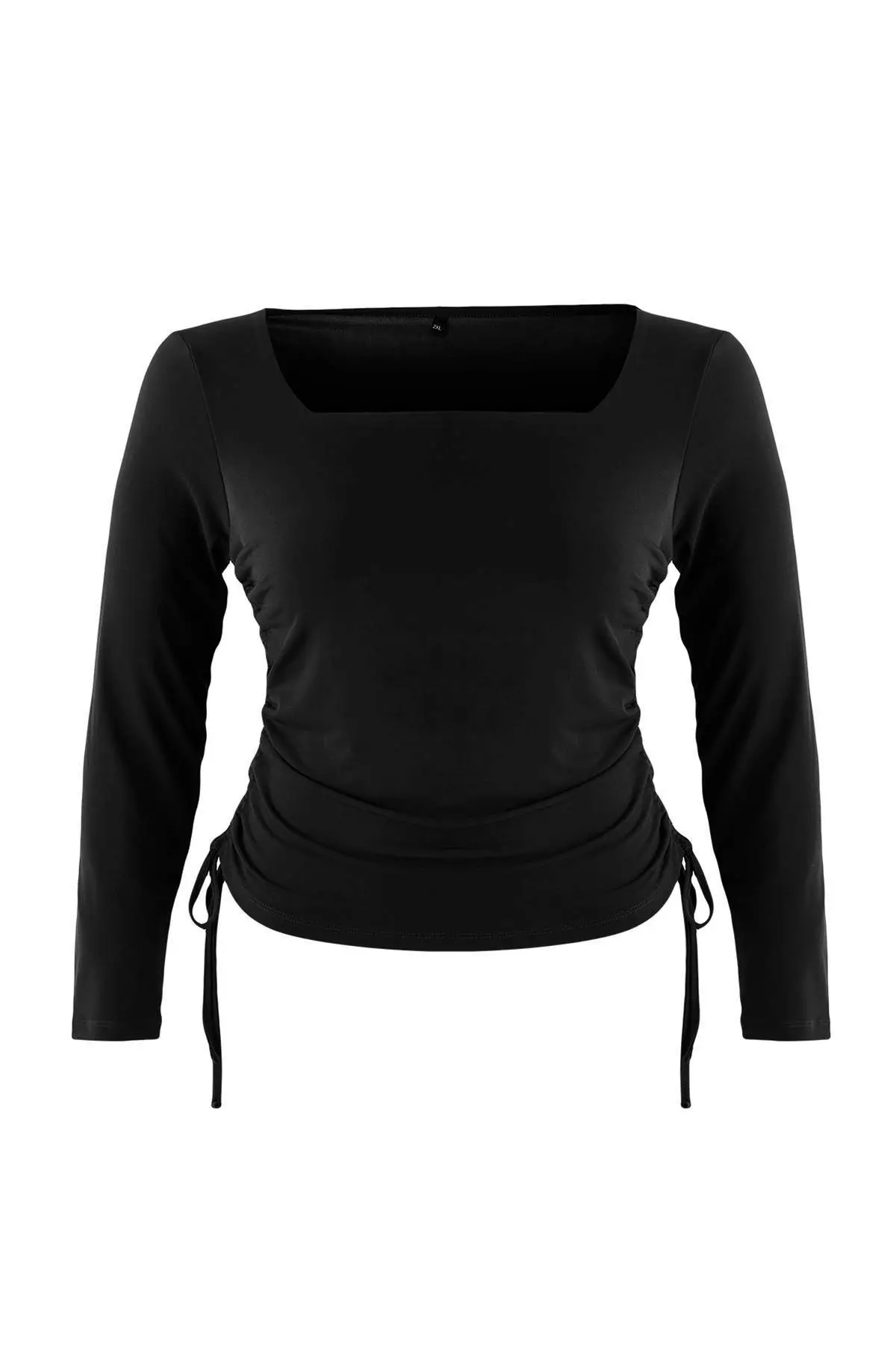 Black Square Neck Side Gathered Knitted Plus Size Blouse