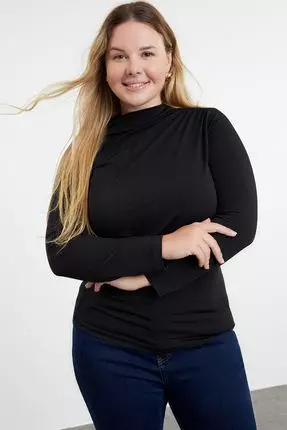 Black Stand Collar Gather Detail Body Fitting Knitted Plus Size Blouse Tbbaw25Af00014