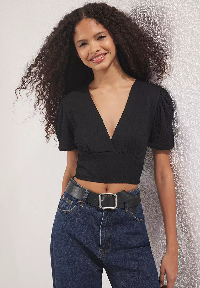 TrendyolBlack Textured V-Neck Double Breasted Closure Balloon Sleeve Crop Knitted Blouse Twoss25Bz00542659.00