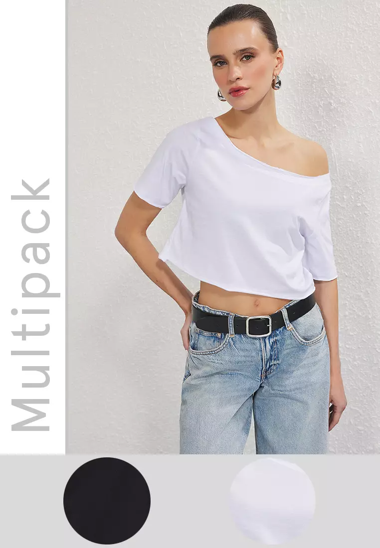Black-White 2-Pack 100% Cotton Asymmetrical Boat Neck Crop Knit T-Shirt TWOSS25TS00194