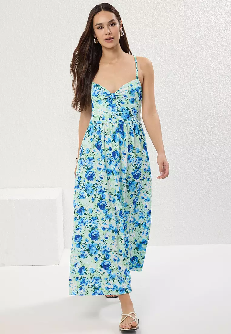 TrendyolBlue Floral Printed Strappy V Neck Pleated Skirt Flounce Ribbed Flexible Maxi Knit Dress Twoss25El002391879.001257.00
