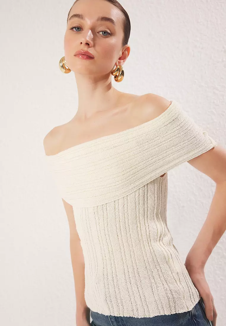 Bone Carmen Collar Textured Knitwear Thin Blouse