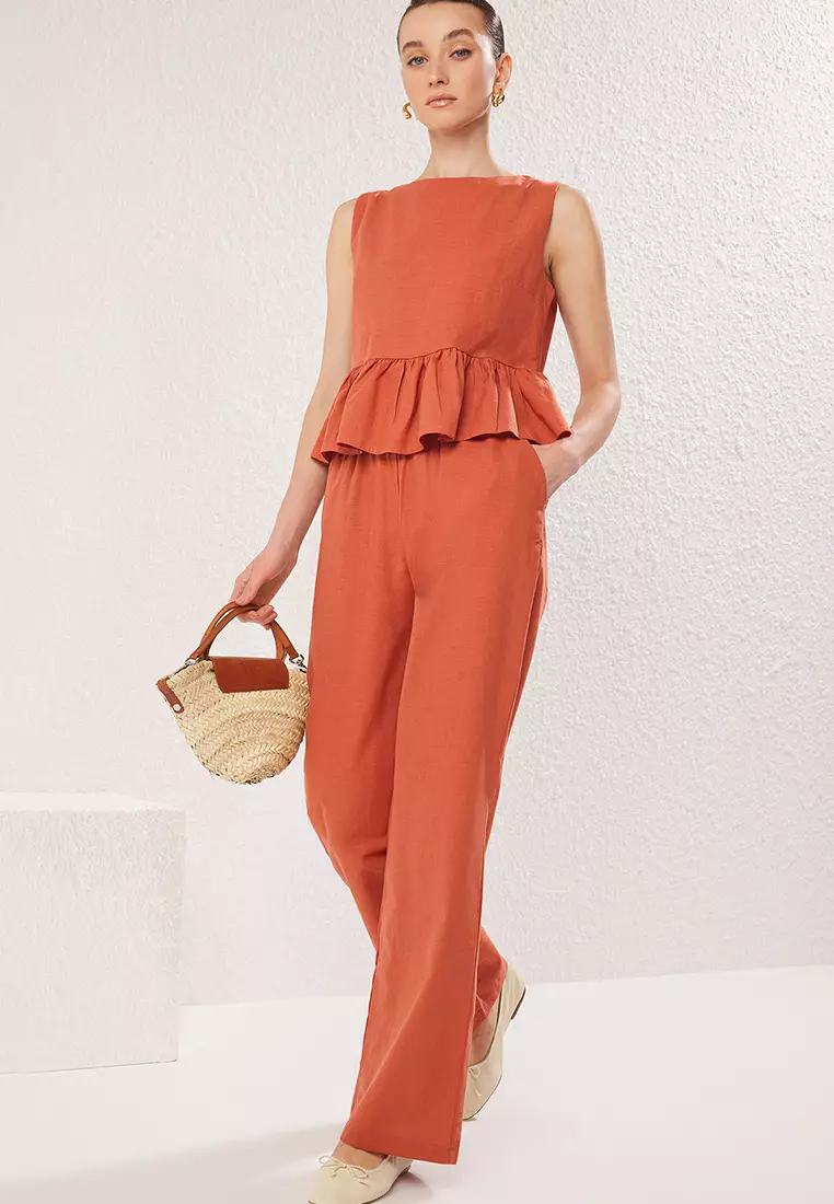 Brick Crew Neck Ruffle Detailed Blouse And Trousers Woven Top Bottom Set