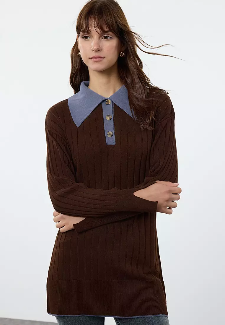 TrendyolBrown Blue Color Block Ribbed Knit Sweater Tctaw25Ak000292149.002038.90