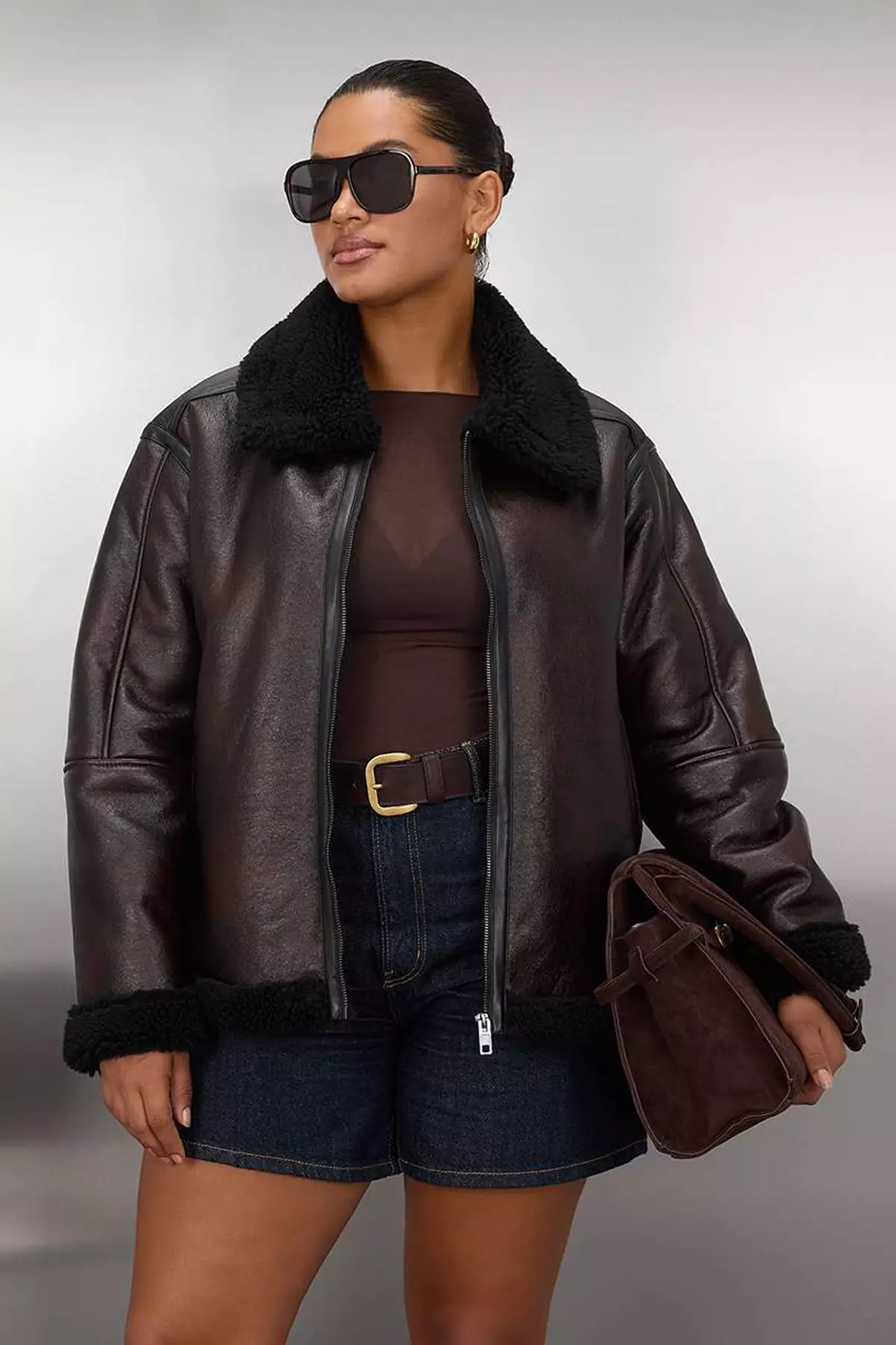Brown Regular Fit Faux Leather Biker Coat with Fur Detail TBBAW25AW00001