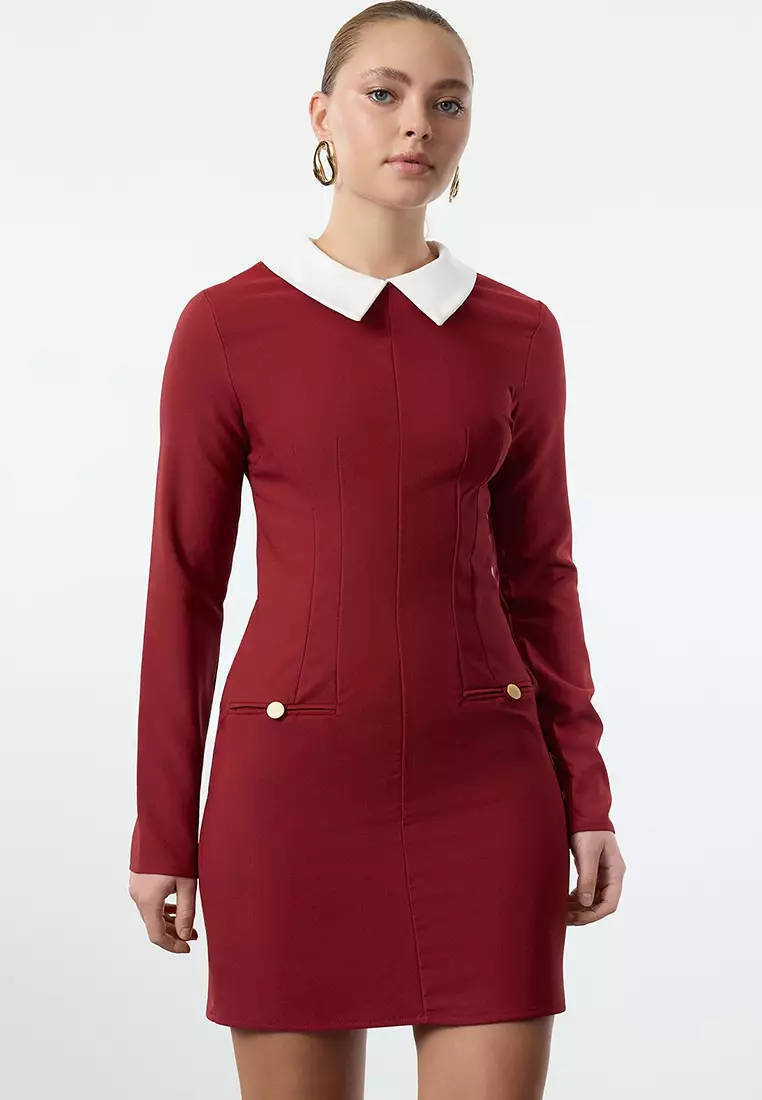 Burgundy Collar Detailed Woven Dress TWOAW24EL00298