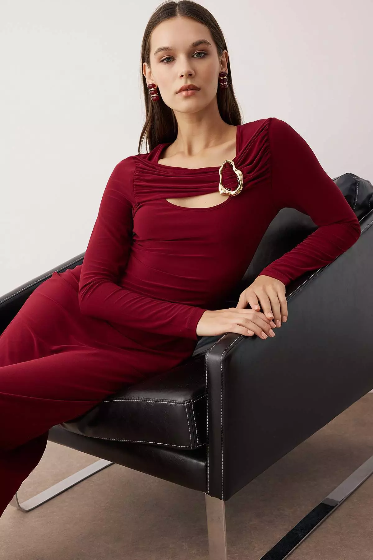 Burgundy Cut Out And Accessory Detailed Body-Fitting Flexible Maxi Knit Dress