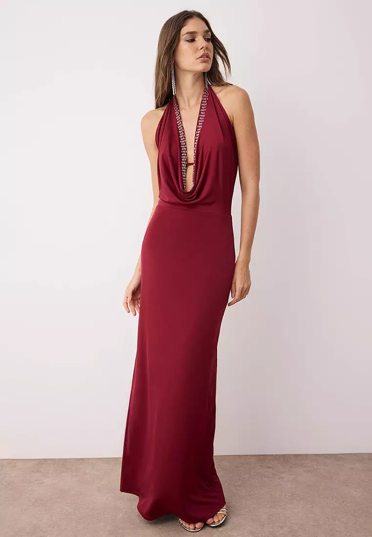 TrendyolBurgundy Degaje Collar Deep Decollete Shiny Stone Detail Evening Dress Evening Graduation Dress3149.002699.00