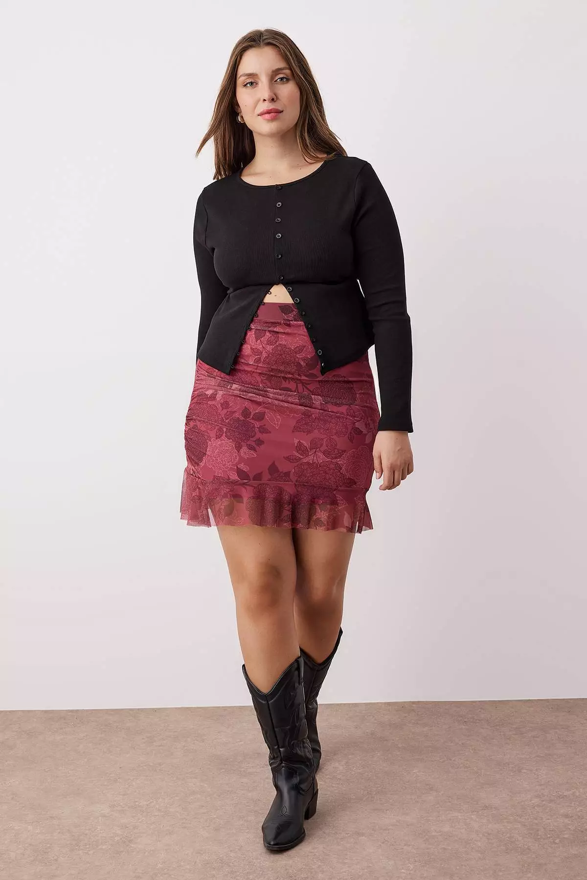 TrendyolBurgundy Floral Mini Knitted Plus Size Skirt1549.00937.00