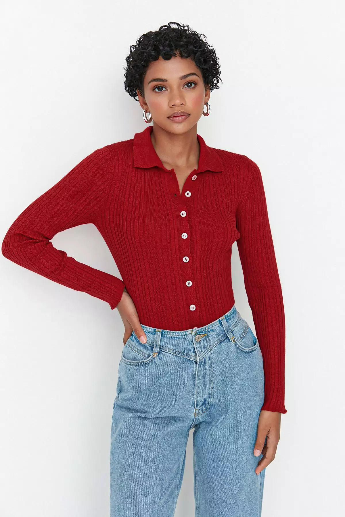 TrendyolBurgundy Mercerized Look Ribbed Polo Neck Knitwear Cardigan2009.001146.00