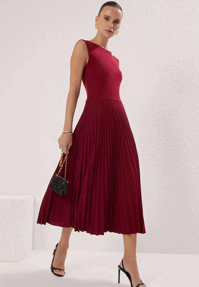 Burgundy Pleated Lined Sleeveless Stretch Knit Midi Dress TWOSS24EL00785