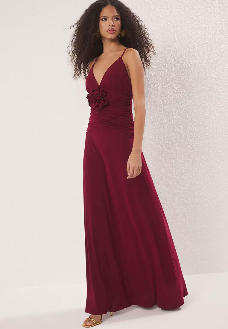 Burgundy Rose Detailed Knitted Maxi Elegant Evening Night Graduation Dress TPRSS25AE00180
