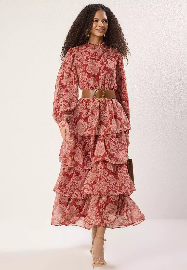 TrendyolCinnamon Stand Collar Patterned Belted Lined Chiffon Woven Dress TCTSS25EB000624159.002291.00
