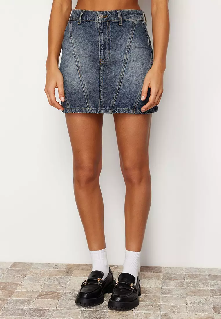 Dark Blue More Sustainable Faded Effect Vintage High Waist Mini Denim Skirt Twoss24Et00082