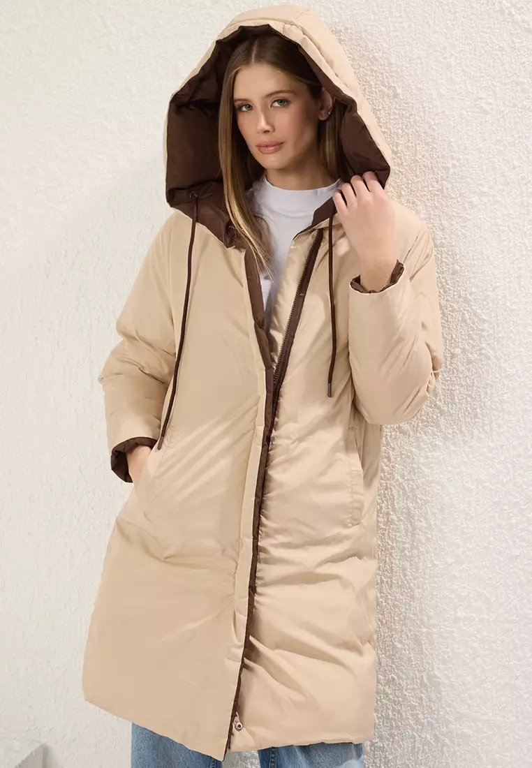 TrendyolDark Brown-Ecru Double-Sided Hooded Water Repellent Long Puffer Jacket TWOAW23MO000524569.003802.00