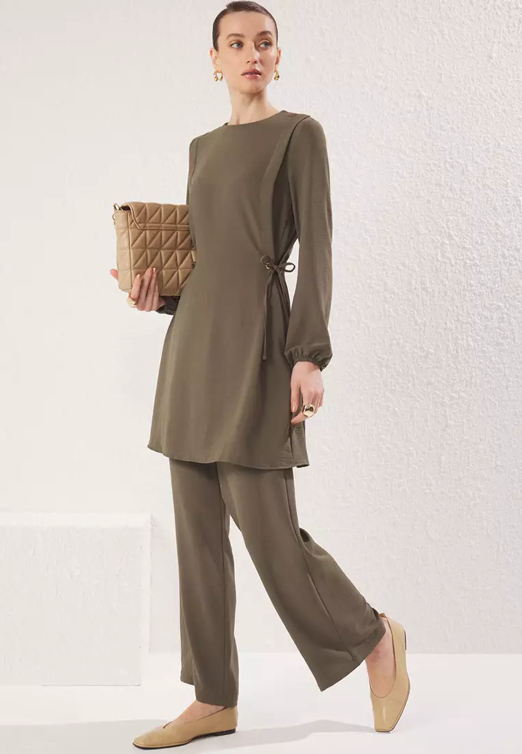 Dark Khaki Eyelet Tie Detail Aerobin Tunic-Pants Set TCTAW22US0092