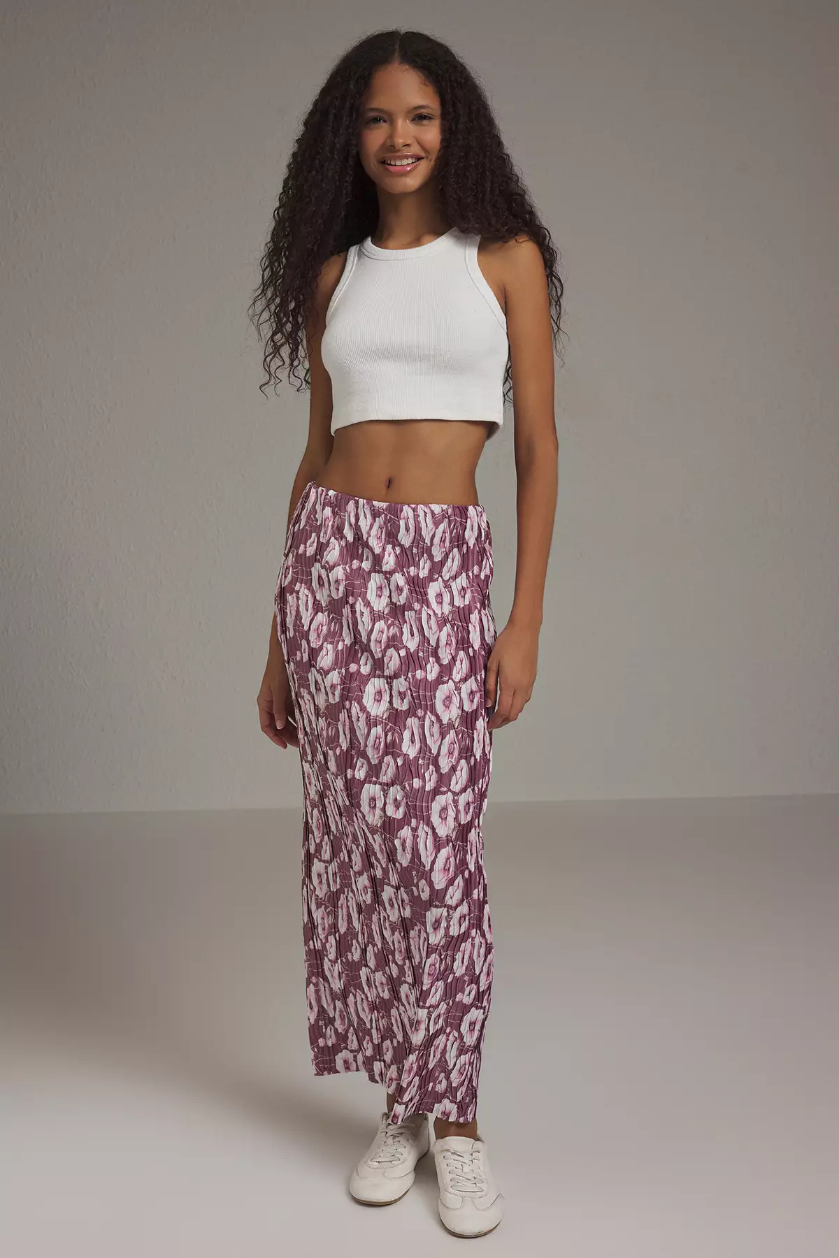 Dusty Rose Floral Print Waist Pleated Maxi Knitted Skirt