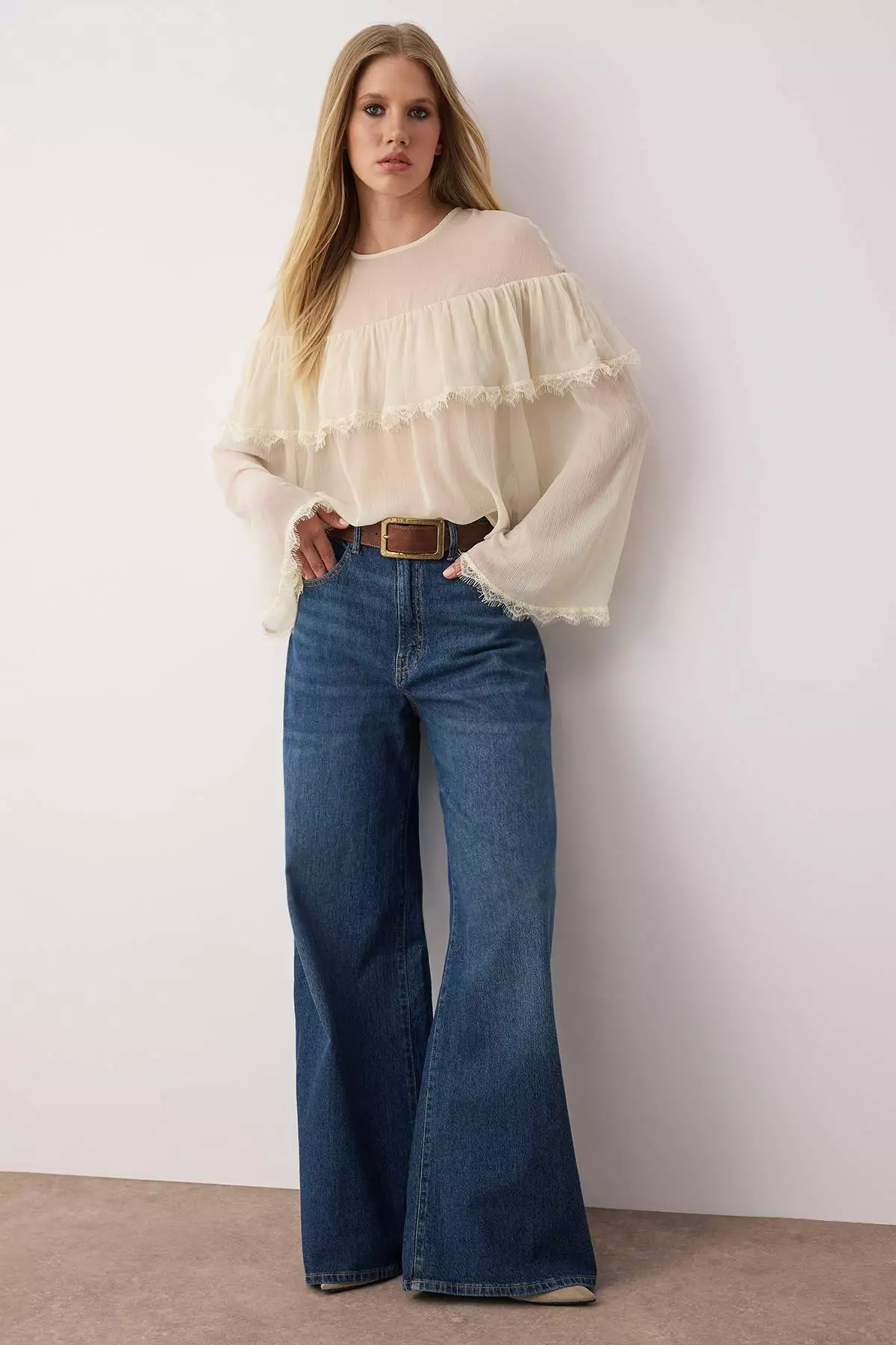 Ecru Chiffon Lace Detailed Crew Neck Blouse