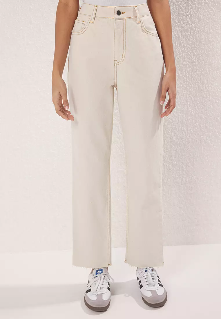 Ecru Cut-Off High Waist Straight Jeans TWOAW25JE00307