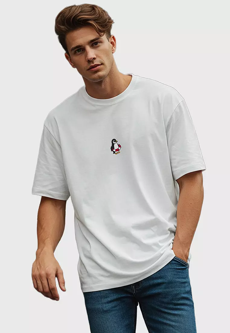 Ecru Oversize/Wide Cut Penguin Embroidered 100% Cotton T-Shirt