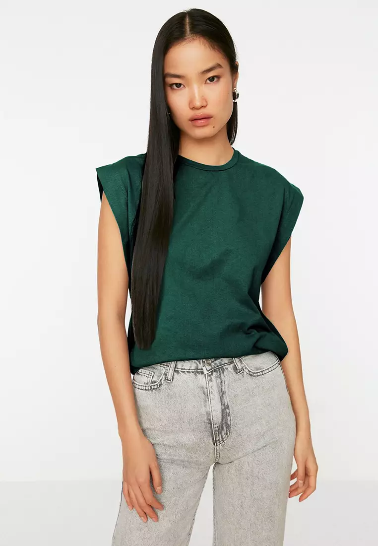 TrendyolEmerald Green Detail 100% Cotton Padded Look Basic Crew Neck Knitted T-Shirt TWOSS20TS0021769.00