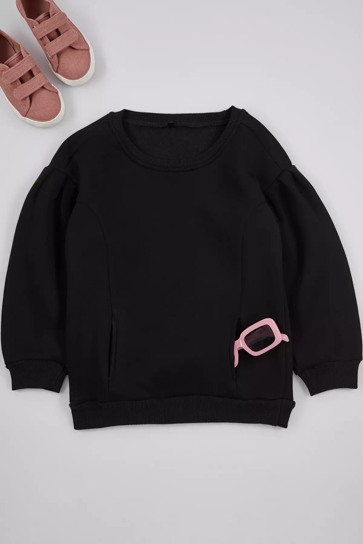 Girl's Black Knitted Sweatshirt - Pocket And Sleeve Drawstring Tkdaw25Sw00025