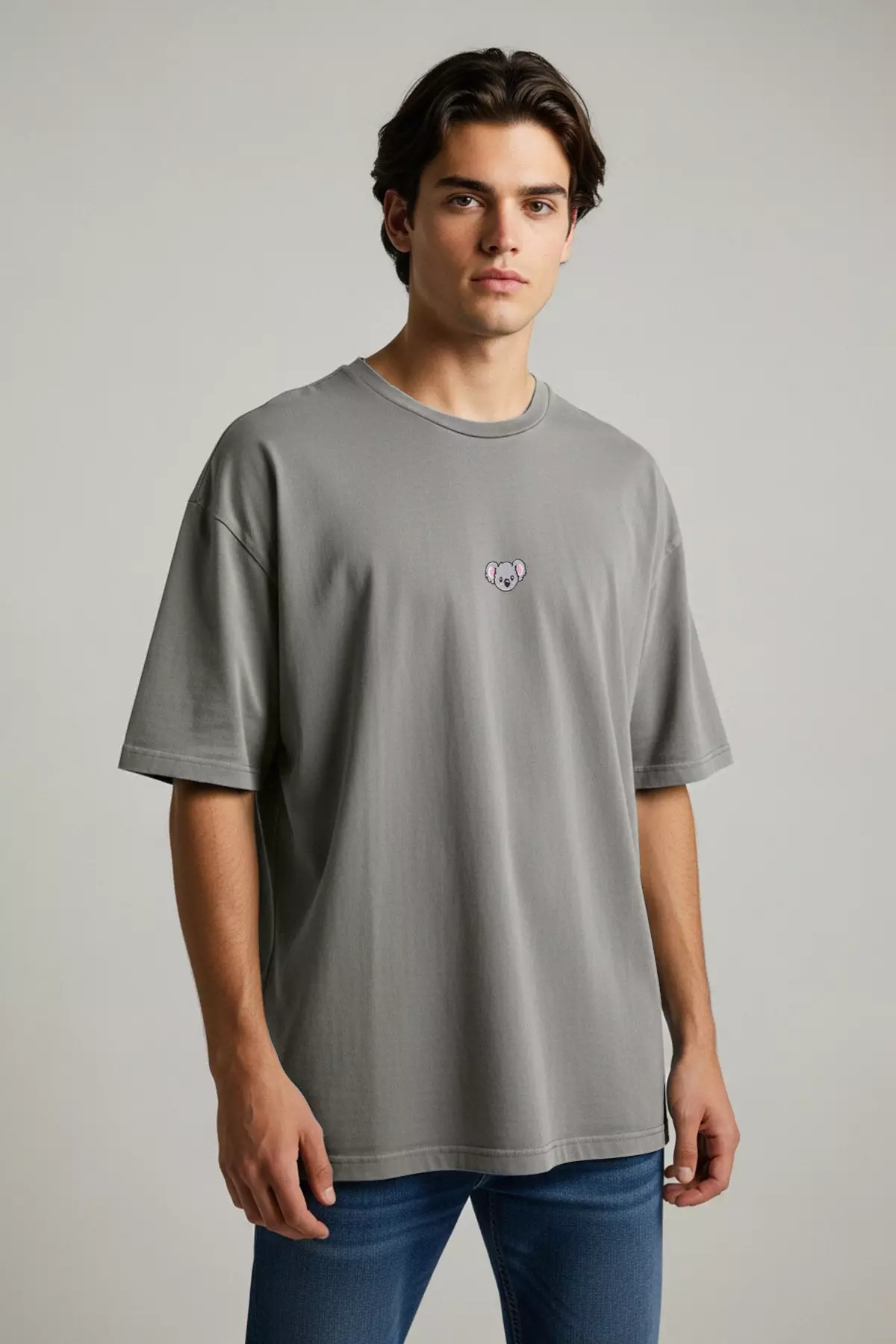 Gray Oversize Koala Embroidered 100% Cotton T-Shirt Tmnss23Ts00243