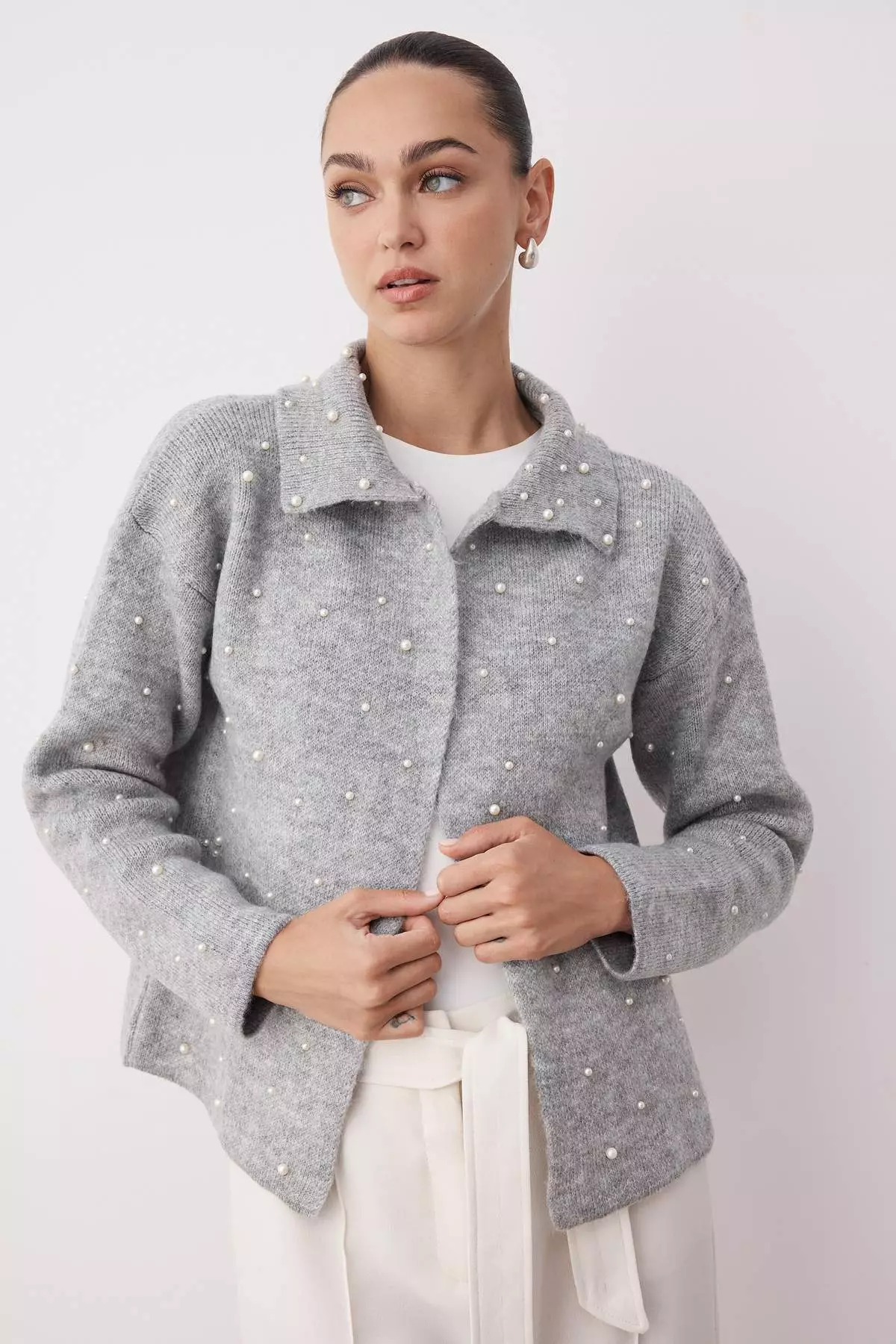 Gray Polo Collar Pearl Detail Wide Fit Knitwear Cardigan