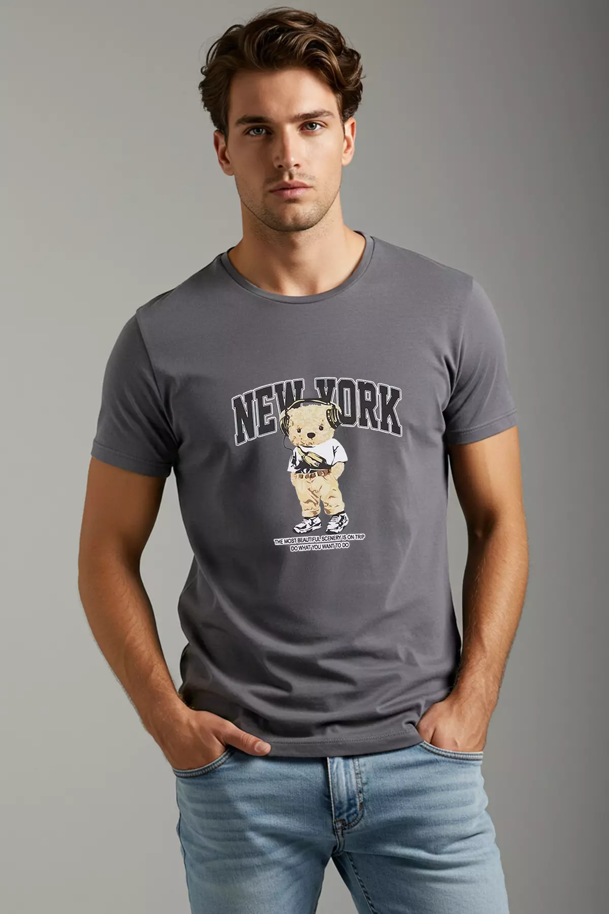 Gray Slim/Fit New York Teddy Bear Printed Cotton T-Shirt Tmnss25Ts00183