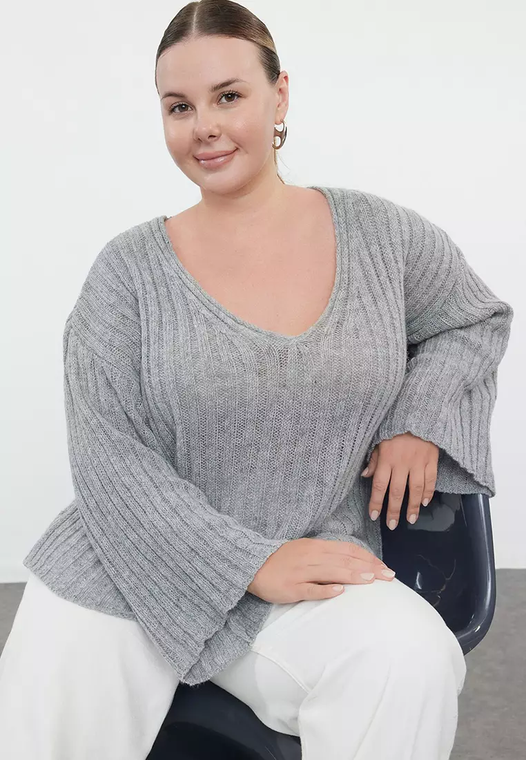 TrendyolGray V-Neck Ribbed Knitwear Sweater Tbbaw25An000231639.001256.00