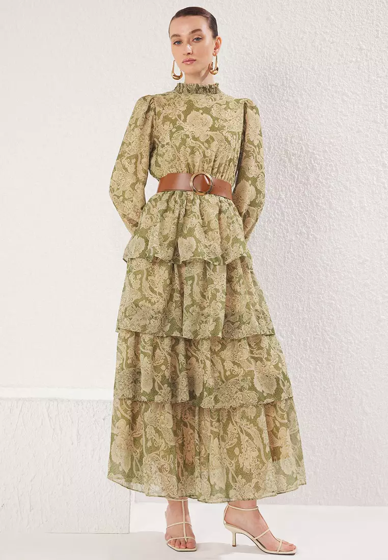 TrendyolGreen Stand Collar Patterned Belted Lined Chiffon Woven Dress Tctss25Eb000624209.002635.00