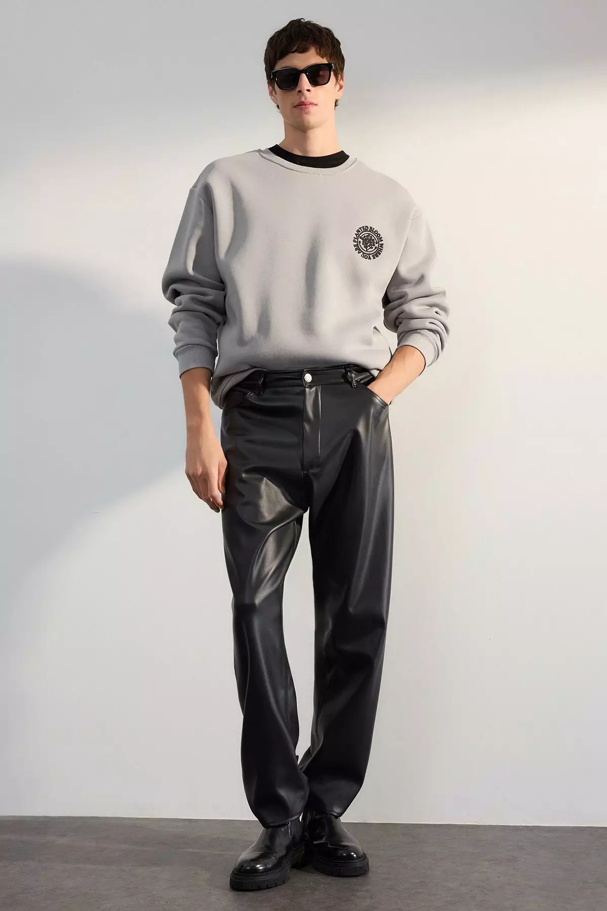 Grey Oversize/Wide Cut Floral Embroidered Fleece Inside Cotton Sweatshirt Tmnaw24Sw00012