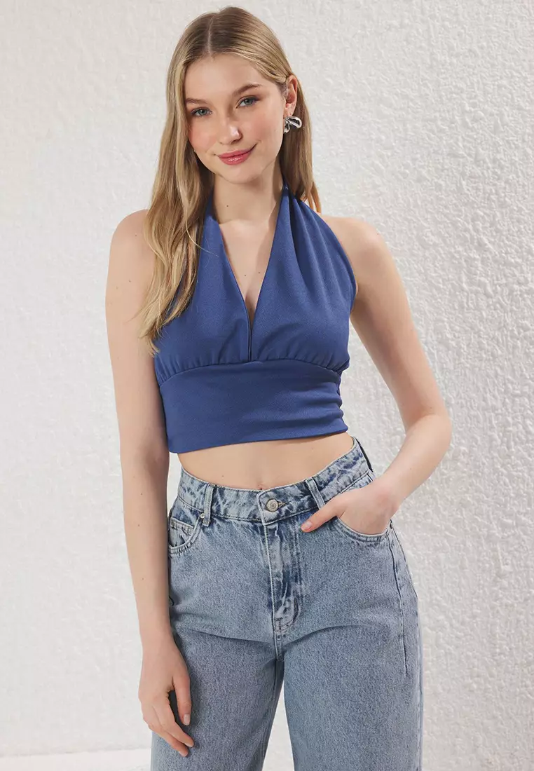 TrendyolIndigo Halter Neck Fitted Crop Knit Blouse Twoss22Bz05442389.00978.90