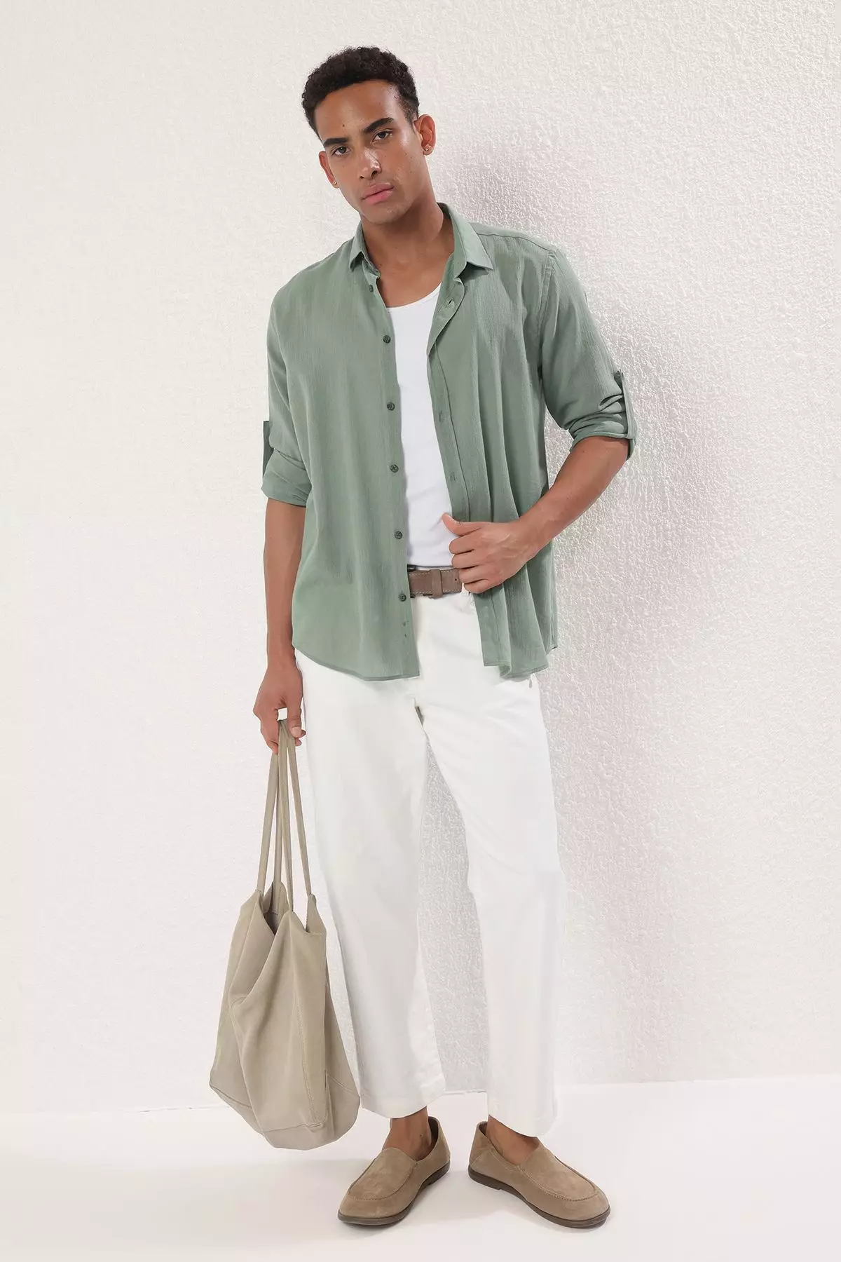 Khaki Regular Fit Epaulette Wrinkled Effect Linen Look Shirt TMNSS23GO00061