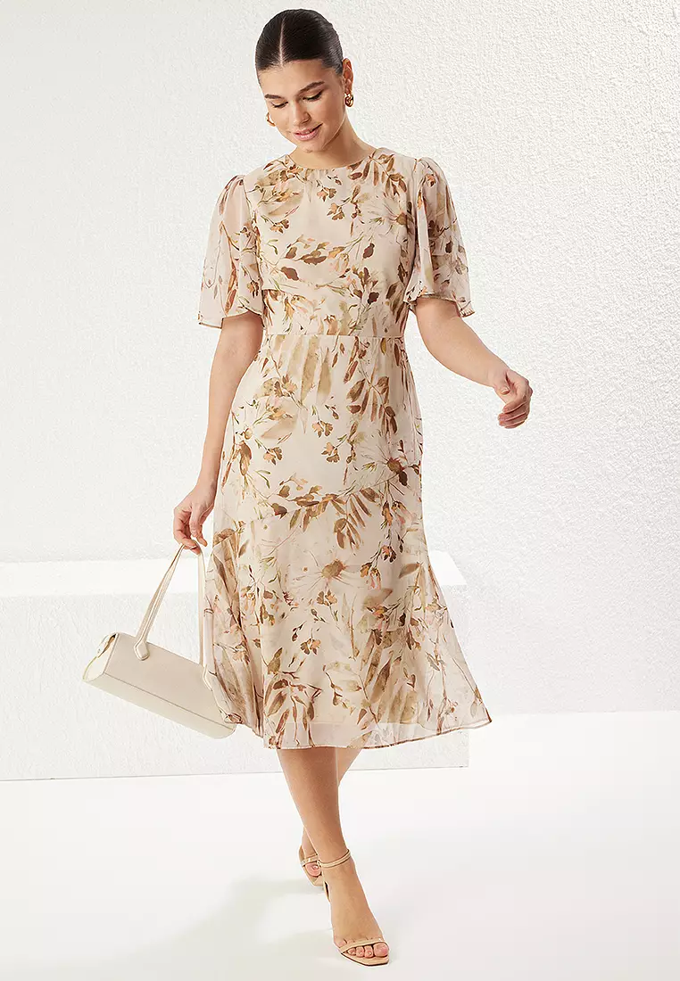 Light Brown Floral A-Line Midi Chiffon Lined Woven Dress