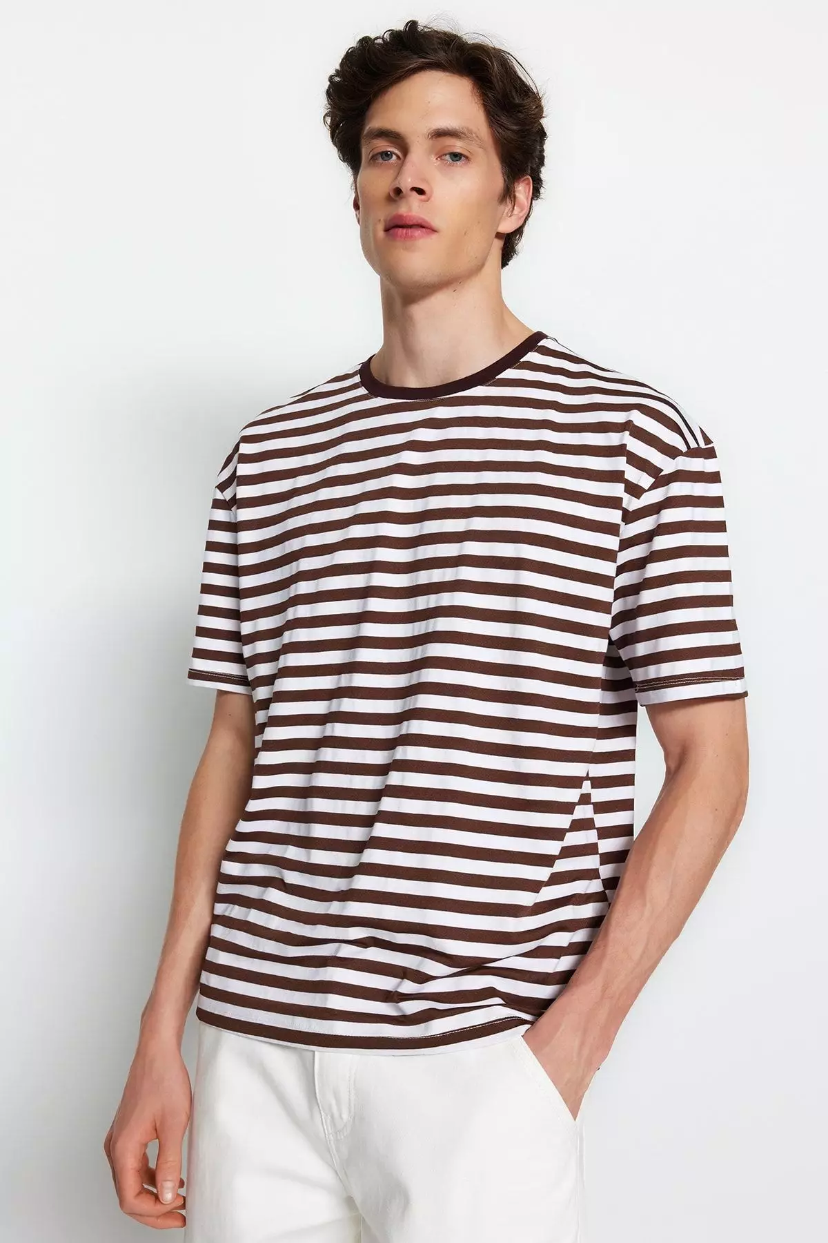 TrendyolLight Brown Oversize/Wide Cut Striped Crew Neck Short Sleeve T-Shirt TMNSS20TS05111199.001076.90