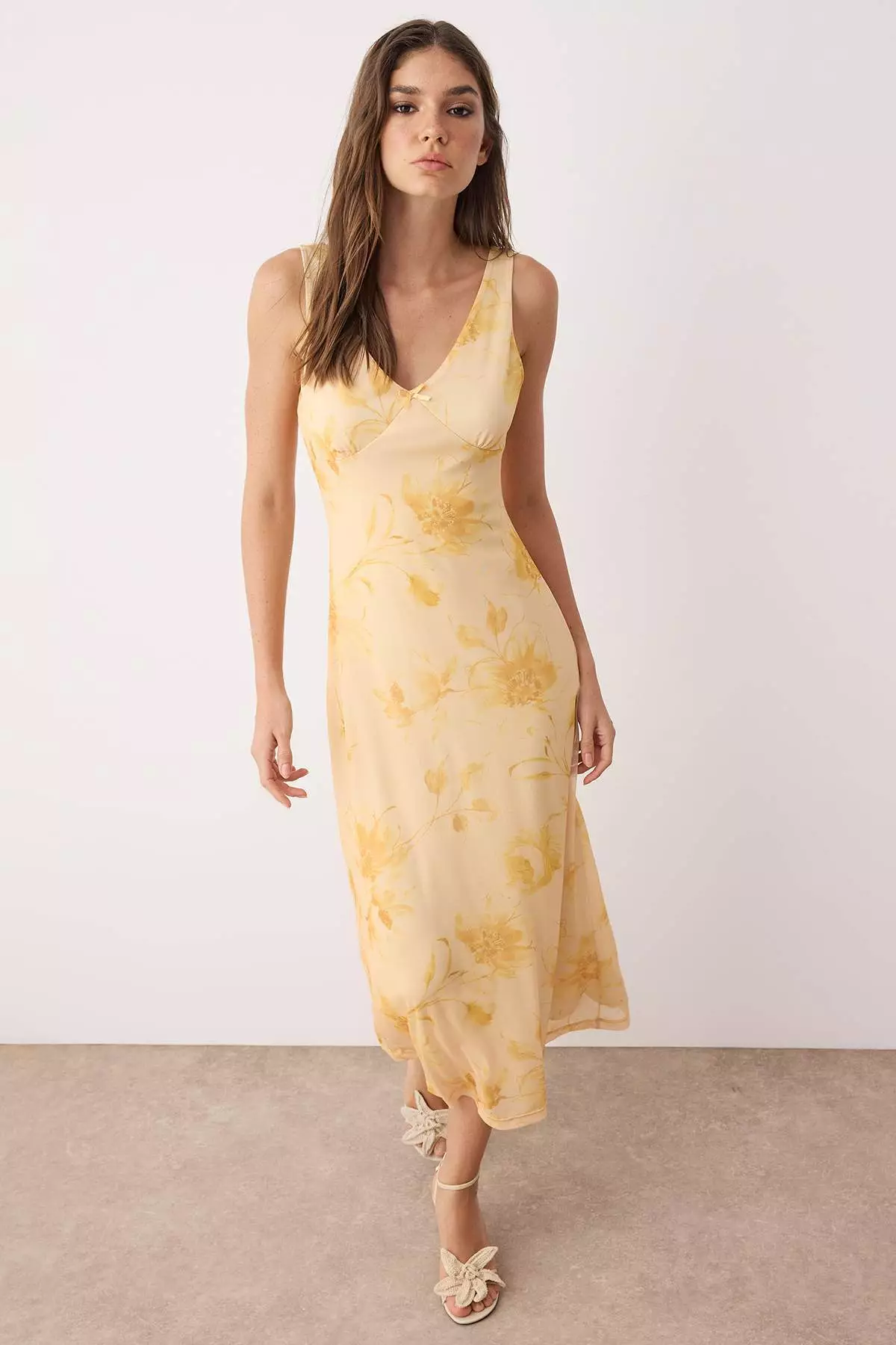 TrendyolLight Yellow Fitted Abstract Bow Maxi Tulle Stretch Knit Dress Twoss25El003611899.001133.00