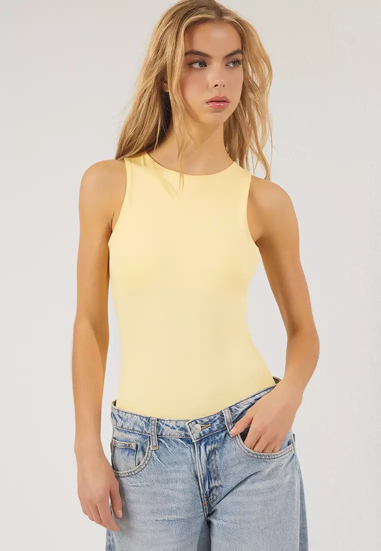 Light Yellow Halter Neck Body Fitted Stretchy Bottom Snap Knitted Body Twoss20Bd0044