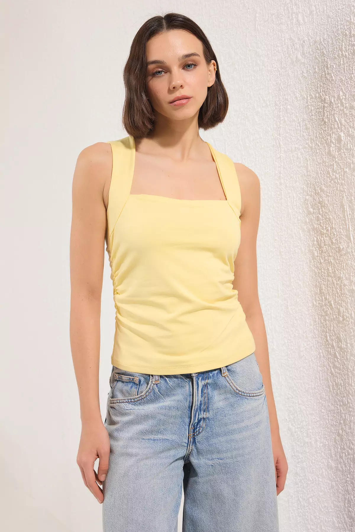 TrendyolLight Yellow Plain Square Neck Strappy Gathered Fitted/Fits Body Flexible Knitted Blouse TWOSS24BZ00400869.00784.00