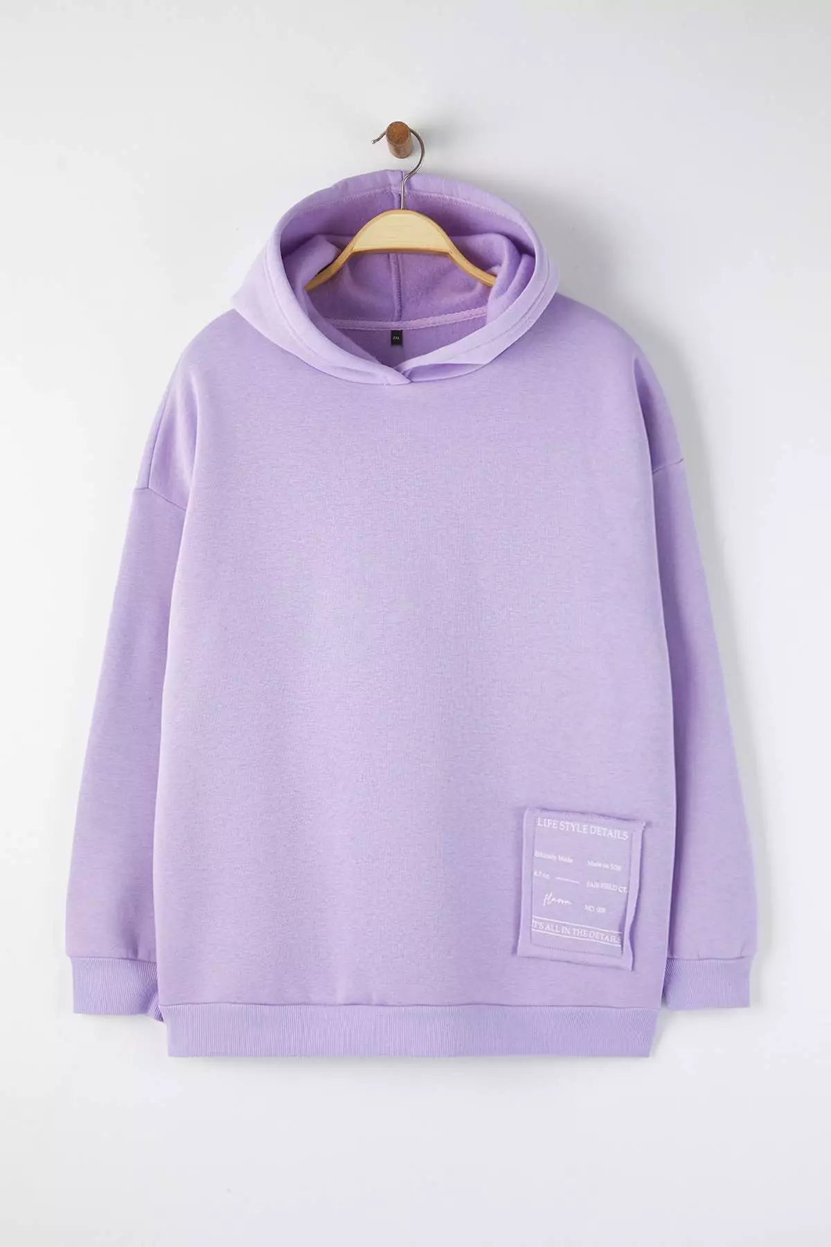 Lilac Hooded Slogan Detailed Fleece Thick Knitted Sweatshirt
