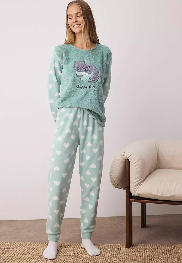 Mint Heart Cat Embroidered Sleep Band Polar Fleece Winter Knitted Pajama Set THMAW21PT0669