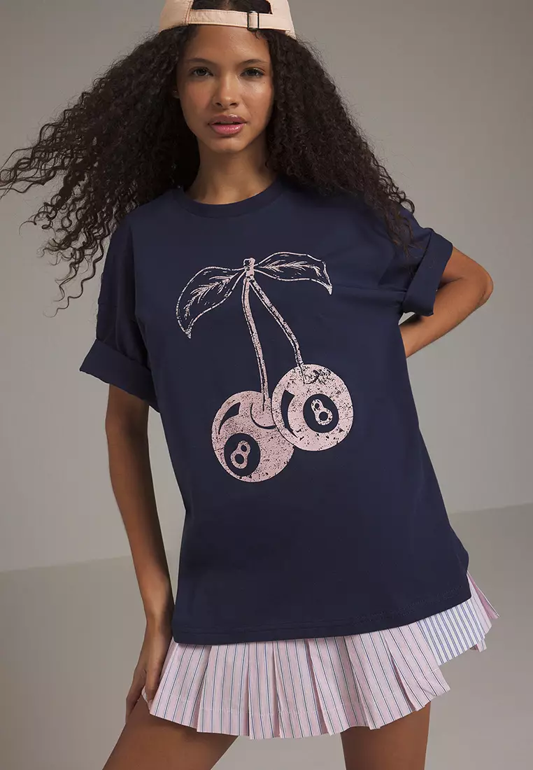 Navy Blue Cherry Printed Oversize/Wide Pattern Knitted T-Shirt