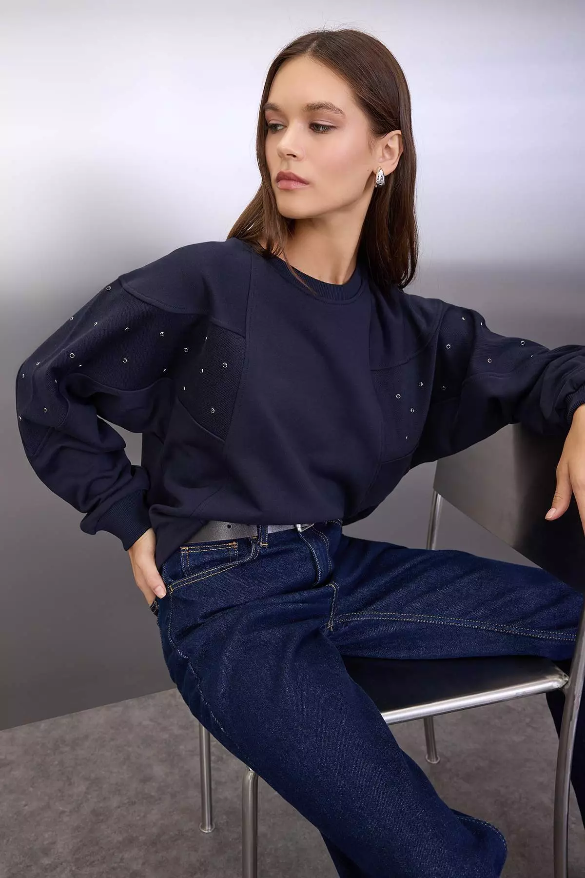 Navy Blue Eyelet Accessory Detailed Crew Neck Oversize/Wide Cut Knitted Sweatshirt