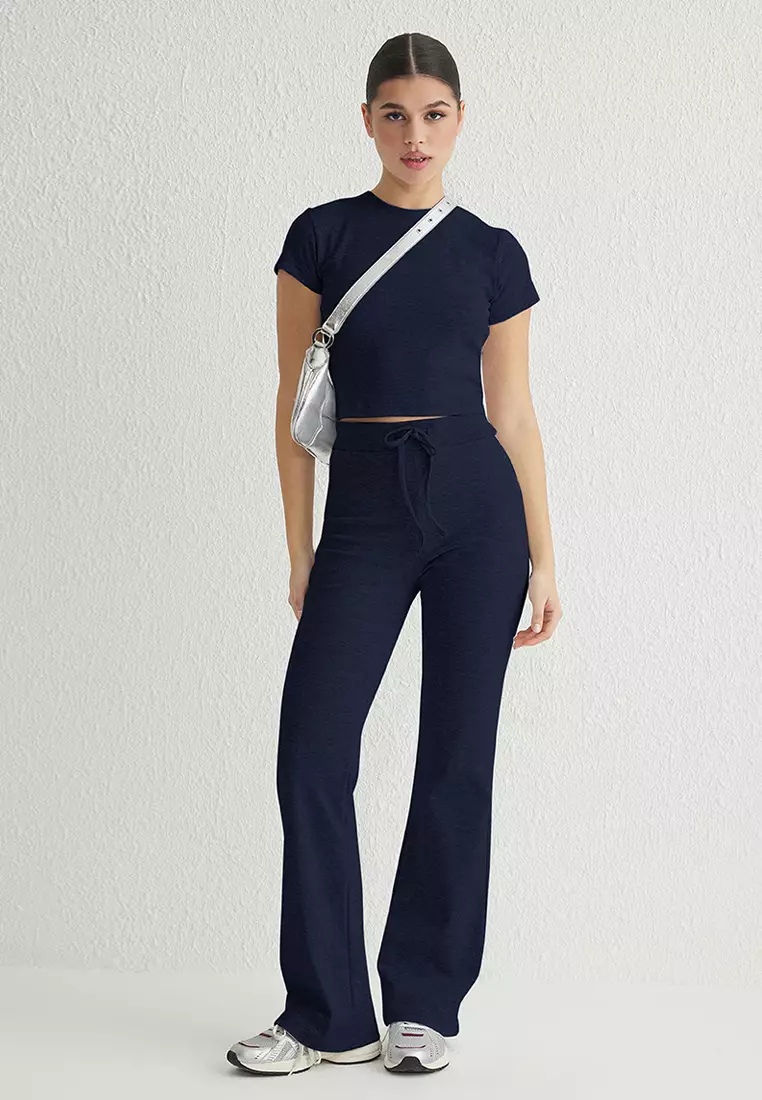 Navy Blue Fitted/Body Fitted Flexible Knitted Bottom-Top Set TWOSS25AU00053