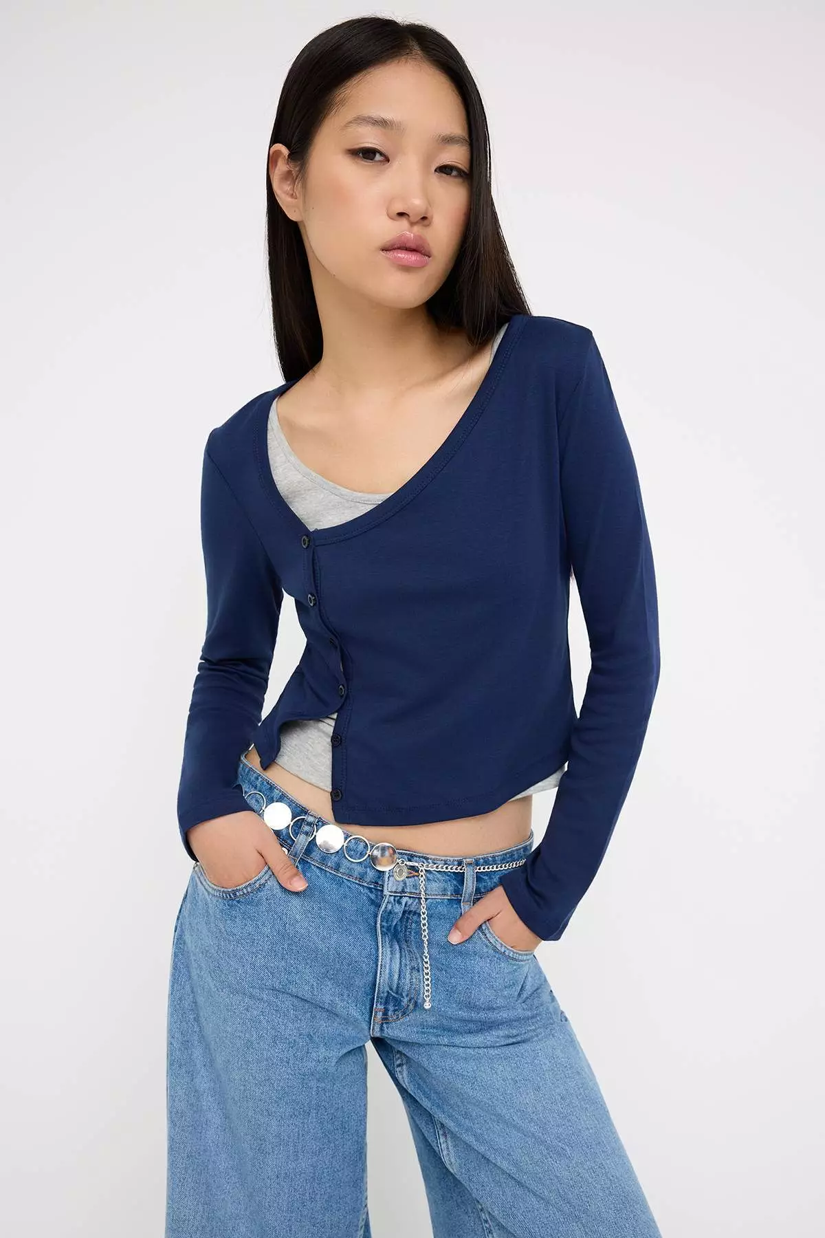 TrendyolNavy Blue-Gray 2-Piece Set Asymmetrical Collar Buttoned Body-Smoothing Flexible Knitted Blouse1199.001000.00