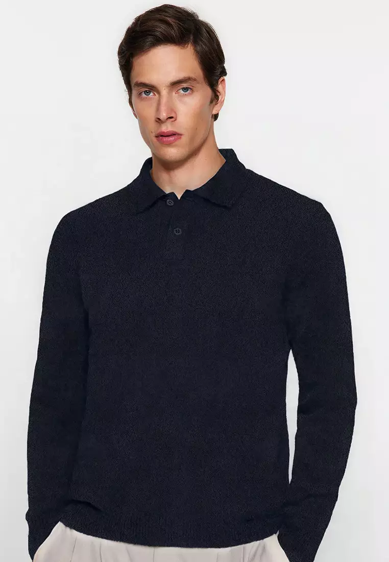Navy Blue Regular Polo Neck Textured Sweater TMNAW25KZ00078